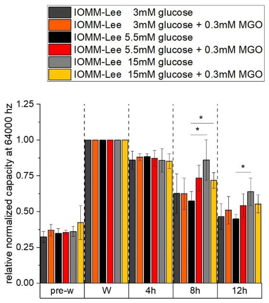 The relative normalized capacity at 64,000 Hz of different glucose with and without MGO treatment in IOMM Lee cells is shown in the graph in Figure 4. The capacity indicates the spreading and confluence of the cells. Measurements taken before the wounding process show the same results as we observed in the impedance measurements.