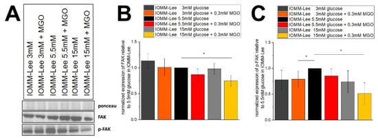 Expression of focal adhesion kinase in IOMM-Lee cells in different glucose levels with and without MGO. Cells were treated with different glucose levels with and without additional treatment with 0.3 mM MGO. (A) representative immunoblot of FAK, p-FAK with Ponceau staining as loading control. (B) quantification with normalized expression of FAK relative to 5.5 mM glucose in IOMM-Lee. (C) quantification with normalized expression of p-FAK relative to 5.5 mM glucose in IOMM-Lee. Statistical analysis was performed using t-test and error bars represent SD (n = 4, p < 0.05 = *).