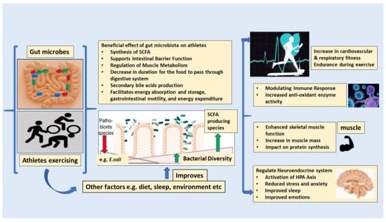 The microbiota of the gastrointestinal tract has a significant impact on muscle functioning, influencing metabolic processes and overall health, which then impacts sports performance. The gut microbiota plays an integral part in the breakdown and assimilation of vital nutrients required for maintaining muscle strength, including amino acids, vitamins, and minerals. In addition, they generate SCFAs, such as butyrate, propionate, and acetate, which play a crucial role in controlling energy metabolism and decreasing muscle inflammation []. SCFAs act as fuel for muscle cells and possess anti-inflammatory characteristics, which aid in enhancing muscle repair and diminishing tiredness [].