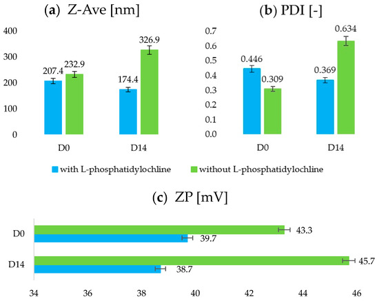 Comparison of physicochemical parameters: Z-Ave (a), PDl (b), and ZP (c) of dispersions of lipid nanoparticles containing and not containing phosphatidylcholine; the pHs of the solutions were within the range 5.33–5.47.