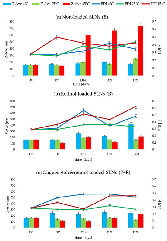 - The changes in the value of the mean particle size of the dispersion depended on the presence of the active substances. For non-incorporated lipid nanoparticles (B), over the assumed 28 days, the Z-Ave value increased depending on the storage temperature by 4% at 4 °C, by 35% at 25 °C and by 77% at 45 °C (p < 0.05) (Figure 2a). The retinol-loaded SLNs (R) recorded Z-Ave values 62% (4 °C) and 24% (45 °C) higher (p < 0.05) compared to the results obtained at D0 and D28. On the other hand, at 25 °C, there was a 4% decrease in the value from 164.0 ± 0.5 to 157.9 ± 1.6 nm (Figure 2b). For sample 3 (P+R) enriched with two active substances, the following values of Z-Ave at day 28 were obtained: 248.3 ± 7.4 nm (+37%), 134.7 ± 0.3 nm (−16%) and 231.1 ± 1.4 nm (+32%) for storage temperatures of 4, 25 and 45 °C, respectively (p < 0.05) (Figure 2c). Significantly, despite the noticeable changes in Z-Ave values for dispersion 3, regardless of storage conditions, the value of 300 nm indicative of stable dispersion in this case was not exceeded [38].