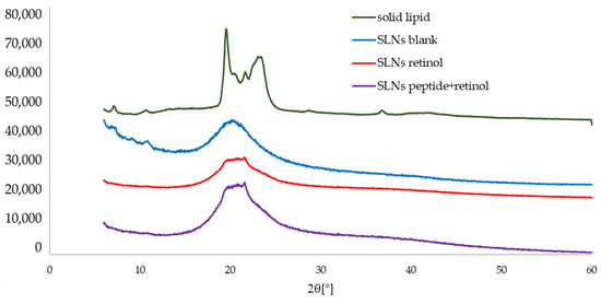 The DSC data were confirmed by XRD analysis. Figure 3 shows the diffractograms for bulk Imwitor® 900 K and unloaded and loaded SLN dispersions. The crystallization profile of the solid lipid revealed two scattered peaks at the angles 2Θ = 19.5° and 23.2°, which indicated the presence of the metastable polymorphic form β′. The effect of the SLN production process itself on the polymorphic state of the lipid was analyzed for both non-incorporated and incorporated formulations. From the patterns, it was noticed that for all three SLN dispersions, the β form was no longer determined. Instead, the observed characteristic single peak on the diffractograms of the dispersions of the lipid nanoparticles was studied. It was attributed to the α form in which the lipid-forming lipid nanoparticle was found due to the transition to a higher energy level after the production of LNs. Analogous results were obtained by Silva et al. when working on SLNs also based on Imwitor® 900 K as a solid lipid [43]. Despite the use of different methods for lipid nanoparticle production, the DSC parameters and crystallization profiles did not differ significantly from those determined for the nanocarriers developed within the framework of this paper. Thus, it can be concluded that the melting behavior of lipid nanoparticles depends mainly on the solid lipid used in their production and the polymorphic form, which affects the values of the determined DSC parameters and XRD results.