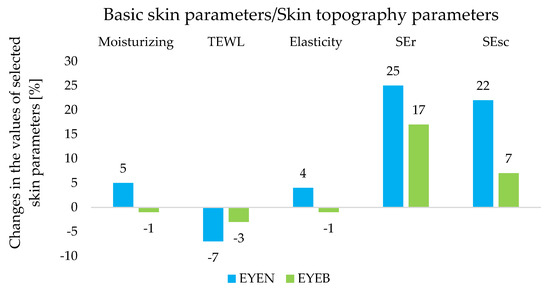 The analysis of SEr, a parameter characterizing skin roughness, and SEsc, a parameter of scaliness, is also important for the diagnosis of epidermal conditions and the degree of keratolytic processes (Figure 4). The SEr value recorded after 8 weeks of EYEN application indicated an increase in the degree of roughness by 25%, while for EYEB, the increase was 17% (p < 0.05) compared to the results obtained at W0. According to the manufacturer’s instructions, the lower the SEr value, the rougher the skin [48]. In addition, the SEsc parameter for the EYEN product increased its value by 22% (T0→T8), while for EYEB, it increased by only 7% (p < 0.05). The lower the SEsc value, the less desquamation of the stratum corneum occurred, indicating a higher level of skin hydration [48]. The analyzed results testified to an accelerated process of the desquamation of the stratum corneum and its increased degree (for EYEN), while these phenomena could also affect the roughness of the epidermal surface. Certainly, the desquamation was related to retinol contained in SLNs, which actively affects the skin by accelerating cell renewal and increasing proliferation while, at the same time, enhancing the differentiation of keratinocytes and synthesis of collagens I, III, and VII [49,50]. Importantly, however, it had little effect on hydration parameters and TEWL, the results of which are described above.