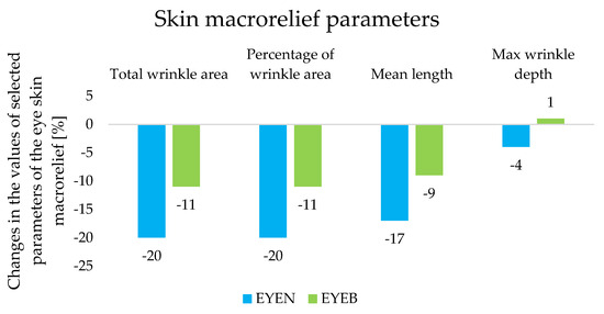 Changes in the values of skin macrorelief parameters determined during an in vivo study for night eye creams after 8 weeks of application.