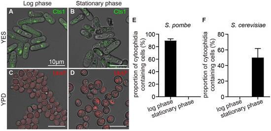 Cytoophidia appear at different phases in two yeast species. (A,B) Cytoophidia formed during log phase (A) but disappeared in stationary phase (B) in fission yeast cultured in YES. (C,D) Cytoophidia were absent in log phase (C) but formed during stationary phase (D) in budding yeast cultured in YPD. Channels: green (Cts1), red (Ura7), and bright field. Scale bars, 10 μm. (E) Proportion of cytoophidia-containing cells in (A,B) (>440 cells were manually measured). (F) Proportion of cytoophidia-containing cells in (C,D) (>636 cells were manually measured). All values are mean ± S.E.M.