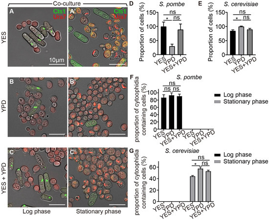 Co-culture of fission yeast and budding yeast. (A–C’) Fission yeast and budding yeast were co-cultured during the log phase and stationary phase in YES (A,A’), YPD (B,B’), and 50% YES+50% YPD mixture (C,C’). Channels: green (Cts1), red (Ura7), and bright field. Scale bars, 10 μm. (D) Proportion of fission yeast in co-culture during stationary phase in YES, YPD, and YES+YPD media (>328 cells were manually measured). (E) Proportion of budding yeast in co-culture in stationary phase in YES, YPD, and YES+YPD medium (>2147 cells were manually measured). (F) Percentage of cells containing cytoophidia in fission yeast in YES, YPD, and YES+YPD medium (>398 cells were manually measured). (G) Percentage of cells containing cytoophidia in budding yeast in YES, YPD, and YES+YPD medium (>3440 cells were manually measured). All values are mean ± S.E.M. *, p < 0.05; ns, no significant difference.