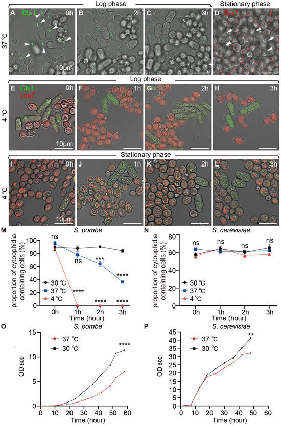 To investigate the influence of high and low temperature conditions on the formation and maintenance of cytoophidia in yeast, we conducted co-cultivations of two yeast species at 37 °C and 4 °C, with cells co-cultured at 30 °C serving as the control. Through live-cell imaging, we observed that fission yeast cytoophidia gradually depolymerized under 37 °C during the log phase (Figure 3A–C). In contrast, budding yeast cytoophidia were not observed during the log phase but emerged in the stationary phase (Figure 3D).