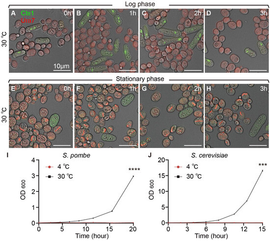 Fission yeast and budding yeast coculture under 30 °C conditions. (A–D) Yeasts in log phase cocultured at 30 °C for 0 h (A), 1 h (B), 2 h (C), and 3 h (D). (E–H) Yeasts in stationary phase cocultured at 30 °C for 0 h (E), 1 h (F), 2 h (G), and 3 h (H). Channels: green (Cts1), red (Ura7), and bright field. Scale bars, 10 μm. (I) Growth curves of fission yeast at 30 °C and 4 °C. (n = 2). (J) Growth curves of budding yeast at 30 °C and 4 °C. (n = 2). All values are mean ± S.E.M. ****, p < 0.0001; ***, p < 0.001.