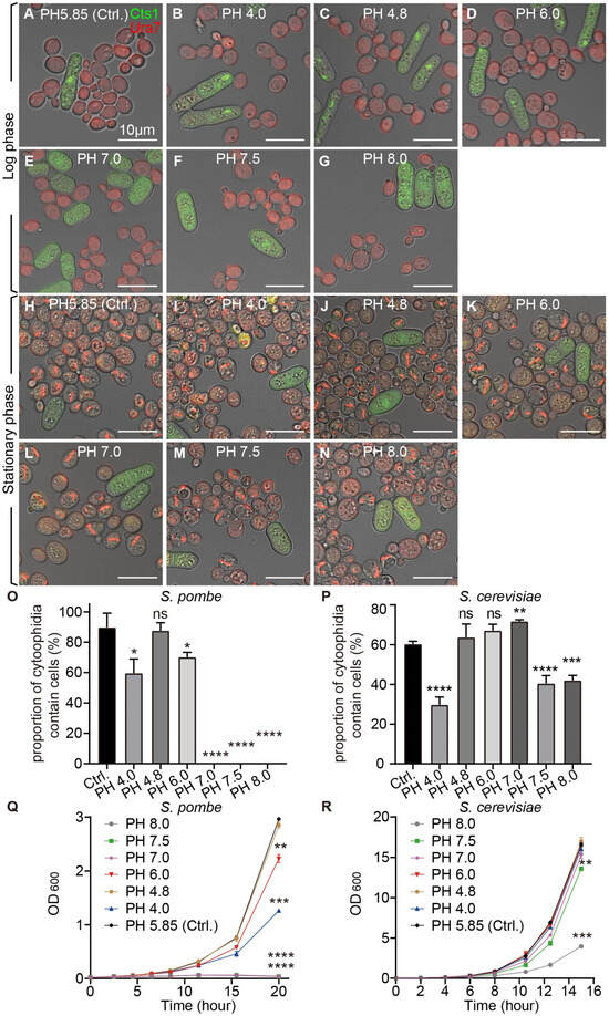 We analyzed data from yeast co-cultured in media with different pH values, respectively. The results showed that compared with the control group, the proportion of cytoophidia-containing fission yeast was decreased in the media with pH 4.0, 6.0, 7.0, 7.5, and 8.0 in the log phase (Figure 5O). In budding yeast in the stationary phase, compared with the control group, the proportion of cytoophidia-containing cells decreased in media with pH 4.0, 7.5, and 8.0; but in medium with pH 7.0, the proportion of cytoophidia-containing cells increased (Figure 5P). Measurement via the OD600 value of fission yeast and budding yeast, respectively, in media with different pH values, showed that the cell growth rate of fission yeast was slowed down in media with pH 4.0, 6.0, 7.0, 7.5, and 8.0 (Figure 5Q). And the growth rate of budding yeast was slowed down in the media with pH 7.5 and 8.0 (Figure 5R). These data showed that both fission yeast and budding yeast cytoophidia were affected by pH in the culture environment.