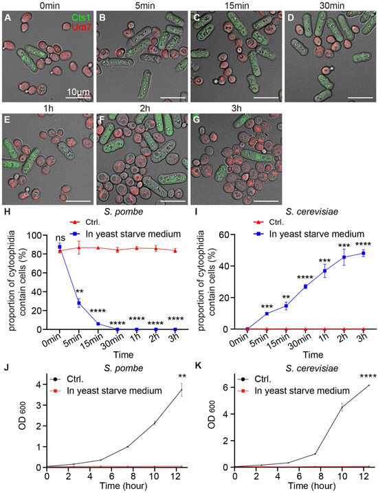 Cytoophidia of both yeast species were influenced by yeast-saturated cultured medium. (A–G) Yeast in log phase co-cultured in the yeast-saturated cultured medium for 0 min (A), 5 min (B), 15 min (C), 30 min (D), 1 h (E), 2 h (F), and 3 h (G). Channels: green (Cts1), red (Ura7), and bright field. Scale bars, 10 μm. (H) Proportion of fission yeast cells with cytoophidia during the log phase in the yeast-saturated cultured medium (>300 cells were manually measured). (I) Proportion of budding yeast cells with cytoophidia during different periods in log phase in the yeast-saturated cultured medium (>1000 cells were manually measured). (J) Growth curves of fission yeast cultured in yeast-saturated cultured medium. (n = 2). (K) Growth curves of budding yeast cultured in yeast-saturated cultured medium. (n = 2). All values are mean ± S.E.M. ****, p < 0.0001; ***, p < 0.001; **, p < 0.01; ns, no significant difference.