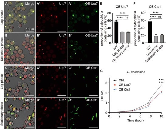 We conducted investigations into whether external environmental factors such as temperature, pH, and nutrient availability in the medium could impact the formation and maintenance of cytoophidia. Previous studies have indicated that changes in intracellular CTPS protein levels can influence cytoophidia in Drosophila [6,23,29,30,31]. Building on this, we explored whether the intracellular CTPS protein factor affected cytoophidia formation and maintenance in both fission yeast and budding yeast. We created strains of fission yeast and budding yeast that overexpressed CTPS proteins. Firstly, we overexpressed the Ura7 CTPS protein in budding yeast and observed the effects on cytoophidia formation. Our observations revealed that cytoophidia began to form in the log phase and persisted until the stationary phase, with the majority transitioning in shape from rod-like to round structures (Figure 7A–B”).