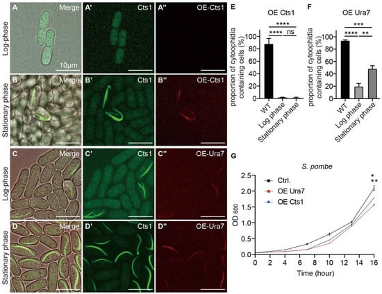 Subsequently, we overexpressed the CTPS protein Cts1 in fission yeast, resulting in an exceedingly low number of cytoophidia-containing cells, approximately 1.5%, being detected in both the log and stationary phases (Figure 8E). Notably, the shape of cytoophidia during the stationary phase appeared elongated compared to the wild type (Figure 8A–B”). Furthermore, when we introduced the CTPS protein Ura7 from budding yeast into fission yeast, cytoophidia formation initiated in the log phase and persisted until the stationary phase, with the cytoophidia exhibiting increased length compared to the wild type (Figure 8C–D”). Additionally, the proportion of cytoophidia-containing cells overexpressing Ura7 decreased in both the log and stationary phases compared to the wild type in the log phase (Figure 8F).
