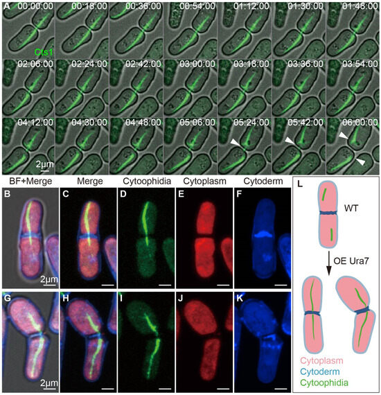 In fission yeast overexpressing Ura7, we observed a peculiar phenomenon where the cytoophidia elongated and extended across two cells. Through live-cell imaging, we tracked this event and discovered that the giant cytoophidia spanning both cells took a considerable amount of time to dissociate (Figure 9A). To further investigate this phenomenon, we utilized Calcofluor White Staining to stain and observe the cells, with red representing the cytoplasm, blue indicating the cell wall, and the cytoophidia being marked in green by endogenous YFP. Our observations revealed that the cytoophidia indeed traversed the membrane and cell wall of both cells following cytoplasmic division (Figure 9B–K). These findings suggest that the overexpression of Ura7 induced cytoophidia elongation, with some cytoophidia capable of crossing the cell membrane and existing in two cells during cell division (Figure 9L).