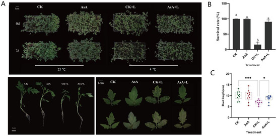 Further observations revealed that the survival rate of seedlings in the AsA + L group was significantly higher than that in the CK + L group, with the survival rate in the AsA + L group being 6.5 times that of the CK + L group (Figure 1B). Under cold stress, the exogenous application of AsA resulted in a 25% increase in root length compared to the control group (Figure 1C). These results suggest that exogenous AsA treatment can effectively mitigate the adverse effects of LT on both the aerial and underground tissues of tomato seedlings, maintaining their morphological structure and improving cold tolerance.