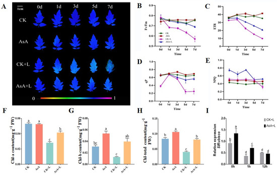 Figure 2. Effects of exogenous AsA on the photosynthetic system of tomato leaves under LT. (A) Images of chlorophyll fluorescence. (B) Maximum photochemical efficiency of PSII Fv/Fm. (C) Apparent photosynthetic electron transport rate (ETR). (D) Photochemical quenching coefficient (qP). (E) Non-photochemical quenching coefficient (NPQ). (F) Chl-a content. (G) Chl-b content. (H) Chl-total content. (I) SlRubisco expression level. Data are presented as the means of 3 biological replicates; different letters indicate significant difference at p-value < 0.05 using one-way ANOVA test.