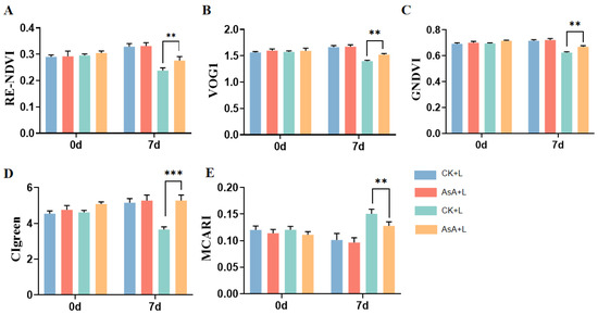Figure 3. Hyperspectral data of tomato seedlings in each treatment group under cold treatment. Five vegetation indices which were closely related to plant physiology were calculated: (A) RE-NDVI. (B) SGNDVI. (C) VOG1. (D) CIgreen. (E) MCARI. Data are presented as the means of 3 biological replicates; ** and *** represent significant at 0.01 and 0.001 level, respectively. Using one-way ANOVA test.