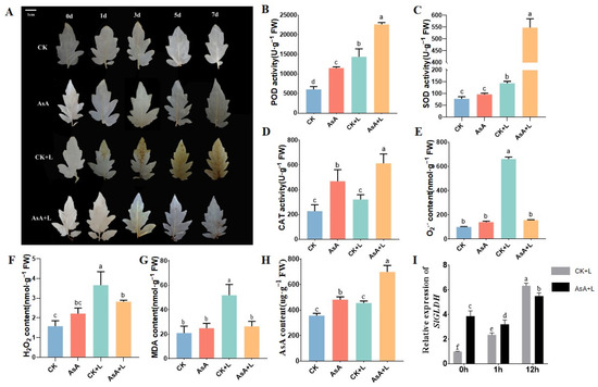 Figure 4. Exogenous AsA enhanced the antioxidant capacity of tomato seedlings under LT. (A) Phenotypes of DAB staining. (B) POD activity. (C) SOD activity. (D) CAT activity. (E) O2− content. (F) H2O2 content. (G) MDA content. (H) Endogenous AsA level. (I) SlGLDH expression level. Data are presented as the means of 3 biological replicates; different letters indicate significant difference at p-value < 0.05 using one-way ANOVA test.