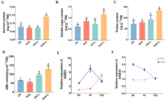 Figure 5. Exogenous AsA increased the accumulation of soluble sugars, proline, and ABA in tomato seedlings under LT. (A) Soluble sugar content. (B) Sucrose content. (C) Proline content. (D) Endogenous ABA content. (E) SlABI3 expression level. (F) SlABA3 expression level. Data are presented as the means of 3 biological replicates; different letters indicate significant difference at p-value < 0.05 using one-way ANOVA test.