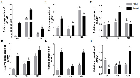 The expression of SlAPX and SlGPX was upregulated at 12 h of LT. These results indicated that cold stress can induce the expression of these genes, and in the short term, SlPOD may play an important role in the antioxidant enzyme pathway under cold treatment. Compared to the control, spraying AsA altered the baseline expression levels (0 h) of antioxidant-related genes in tomato plants, with significant upregulation of the expression levels of SlPOD, SlSOD, SlAPX, and SlGPX. Notably, under LT conditions, the expression trends of these antioxidant genes were changed, except for SlPOD, SlSOD, and SlCAT. Compared to the control group, the expression levels of SlPOD and SlCAT further increased after 1 h of cold exposure (Figure 6A–C). The expression trends of SlSOD, SlAPX, and SlGPX in the AsA + L group differed from those in the CK + L group, but their expression levels were higher than those in the CK + L group (Figure 6D,E). Interestingly, the background level of the SlGlut gene in tomato plants did not increase as the genes mentioned above after the external application of AsA, but its expression was rapidly upregulated after 12 h of LT, which was higher than that in the CK + L group. Its expression was upregulated by 313.3% (Figure 6F).