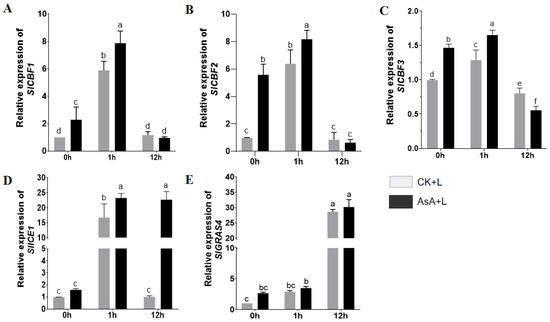 We then analyzed the expression of several key genes involved in the ICE1-CBF pathway and the SlGRAS4 pathway (Figure 7), two currently recognized tomato cold-regulated pathways. The results demonstrated that after 1 h, the expression of SlICE1, SlCBF1, SlCBF2, and SlCBF3 was dramatically upregulated. Compared to the CK + L group, exogenous AsA treatment further upregulated the expression of these genes (Figure 7A,C,D). However, the expression trend of SlGRAS4 in the exogenous AsA-treated group was similar to that in the control group and did not display substantial changes (Figure 7E). These data suggest that the effect of AsA in promoting cold tolerance primarily operates through the ICE1-CBF pathway.