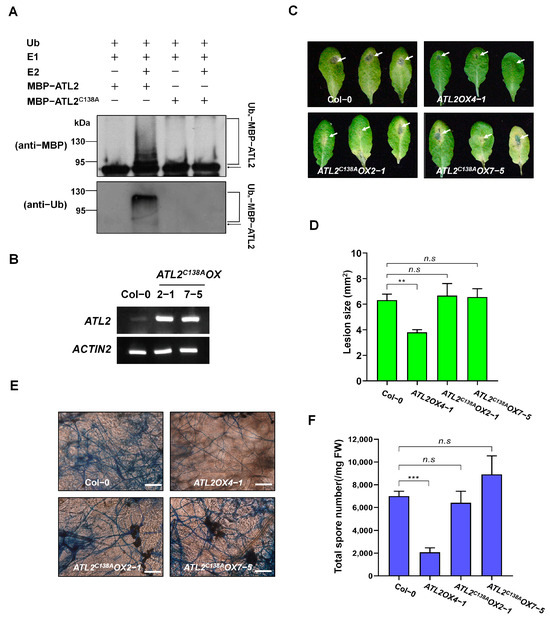 - Kim, D.; Jeon, S.J.; Hong, J.K.; Kim, M.G.; Kim, S.H.; Kadam, U.S.; Kim, W.-Y.; Chung, W.S.; Stacey, G.; Hong, J.C. The Auto-Regulation of ATL2 E3 Ubiquitin Ligase Plays an Important Role in the Immune Response against Alternaria brassicicola in Arabidopsis thaliana. Int. J. Mol. Sci. 2024, 25, 2388. [Google Scholar] [CrossRef]