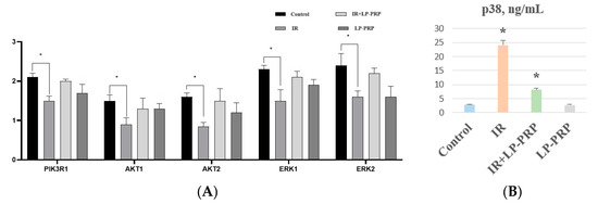 Expression of genes of the PI3K/AKT (PI3KR1, Akt1, Akt2), ERK (Erk1, Erk2), and MAPK/p38/JNK signaling pathways in the rats’ ovaries in control and seven days after local electron irradiation (IR) and/or leukocyte-poor platelet-rich plasma (LP-PRP) injections (A). The abscissa axis shows the studied genes in the control and experimental groups; the ordinate axis shows the relative gene expression. Data are presented as means and confidence intervals. Expression levels of p38 in control and experimental groups by an ELISA in ng/mL, graph (B). Data are presented as means ± standard error. *—statistically significant differences compared to the control (p < 0.05).