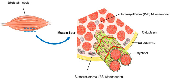 Mitochondrial homeostasis in skeletal muscle cells is essential for maintaining the normal physiological functions. Skeletal muscle, serving as the body’s primary organ for movement and heat production, endures substantial metabolic demands. Mature skeletal muscle fibers accumulate hundreds to thousands of nuclei derived from resident muscle stem cells (MuSCs) through a process of cellular fusion [19]. These fibers are replete with mitochondria, which are capable of modulating their metabolic capacity in response to physiological stimuli. The skeletal muscle has even evolved a specialized mitochondrial system to match its high energy expenditure, with mitochondria classified into subsarcolemmal (SS) mitochondria and intermyofibrillar (IMF) mitochondria. SS mitochondria, typically located beneath the sarcolemma, constitute about 20% of the total mitochondrial population in skeletal muscle, while IMF mitochondria, situated in the spaces between myofibrils, account for the remaining 80% [20,21] (Figure 1). A hallmark of skeletal muscle aging is mitochondrial dysfunction, characterized by morphological abnormalities (such as swelling, increased branching, and structural damage like ruptured membranes, loss of cristae, matrix dissolution, and vacuolization), alterations in mitochondrial membrane potential, and disarray in mitochondrial protein function.