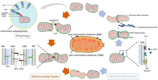 The dynamic balance of mitochondrial fission, fusion, and mitophagy. DRP1 is activated through interaction with its receptors (FIS1, etc.), thereby mediating mitochondrial fission. Mitochondrial fusion is facilitated by MFN1/2 and OPA1. MFN1/2, located in the OMM, mediate the fusion of the outer membrane, while OPA1 is involved in the fusion of the inner membrane, preserving the structure of the cristae and the integrity of the inner membrane.