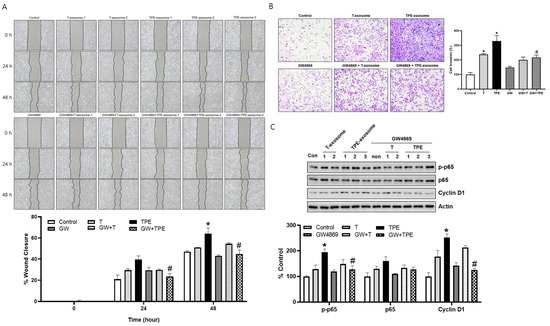GW4869 inhibits the cellular migration and invasion induced by TPE-derived exosomes. (A) The migration rates of A549 cells exposed to TPE-derived or transudate-derived exosomes and with or without GW4869 treatment were measured in wound healing assays (magnification: ×100). * p < 0.05 vs. control, # p < 0.05 vs. TPE. (B) The invasion rates of A549 cells exposed to TPE-derived or transudate-derived exosomes and with or without GW4869 treatment were measured in Transwell assays (magnification: ×100). * p < 0.05 vs. control, # p < 0.05 vs. TPE. (C) Expression of p65 and cyclin D1 as measured via Western blotting in A549 cells treated with TPE-derived or transudate-derived exosomes with or without GW4869. All experiments were performed in triplicate.