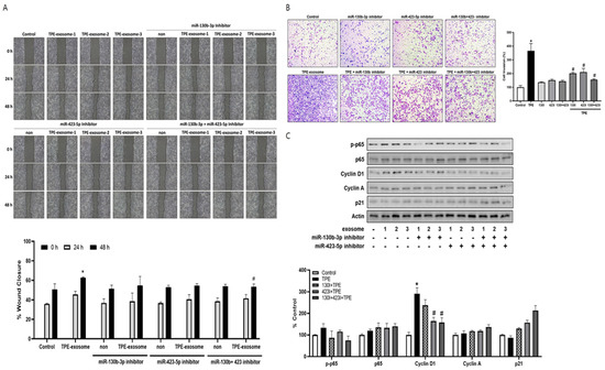 The contribution of the transfer of select miRNAs from TPE-derived exosomes to lung cancer cell invasion was investigated by transfecting A549 cells with inhibitors of miR-130b-3p and miR-423-5p before their treatment with TPE-derived exosomes. In both the wound healing and Transwell invasion assays, the two inhibitors reversed the enhanced migration and invasion induced by TPE-derived exosomes (Figure 4). Based on our data showing that TPE regulates cell cycle proliferation through the p65–cyclin D pathway, the effect of exosomal inhibitors on regulators of the cell cycle was examined. Cyclin A, cyclin D1, and p21 are regulators of the G1 to S phase transition in mammals [17]. The levels of p-p65 and cyclin D1 were lower and those pf P21 were higher in A549 cells transfected with miR-130b-3p and miR-423-5p inhibitors before their treatment with TPE-derived exosomes than in cells treated with TPE-derived exosomes alone. The level of cyclin A was not significantly affected.