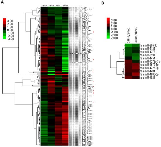 Differential expression of miRNAs in HaCaT cells under high-glucose/hypoxia versus normal conditions. (A) Heat map and cluster dendrogram of 143 differentially expressed miRNAs. Columns represent miRNA expression at 24 h and 48 h under normal (24 hr1 and 48 hr1) and high-glucose/hypoxia (24 hr4 and 48 hr4) conditions. (B) Heat map and cluster dendrogram of 11 miRNAs with the highest changes on the expression levels at 24 and 48 h post-wounding (labeled with red asterisks in (A)). This heat map shows miRNA changes after the normalization of the high-glucose/hypoxia condition over the normal condition. Subsequent qRT-PCR verification on these miRNAs is shown in Figure 2.