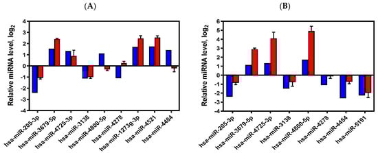 qRT-PCR was performed to validate microarray results []. cDNA was synthesized using the TaqMan® MicroRNA Reverse Transcription Kit (Thermo Fisher Scientific). PCR was conducted using a MiniOpticonTM real-time PCR system (BioRad, Hercules, CA, USA). The primers used for corresponding miRNAs are listed in Table 2. Relative miRNA expression was calculated using the comparative threshold cycle (CT) method, normalized to U6 snRNA.