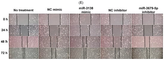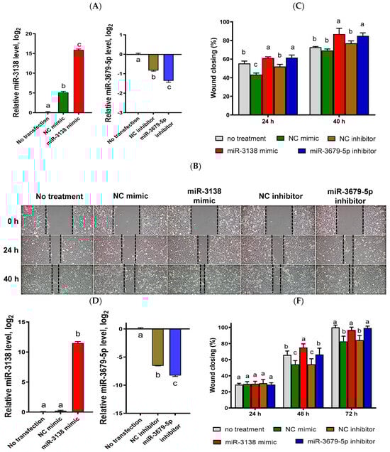 Scratch wound healing assays revealed that cells transfected with the miR-3138 mimic or the miR-3679-5p inhibitor migrated faster than non-transfected cells and those transfected with negative control (NC) mimic and inhibitor (Figure 3B,E). Under normal conditions, wound closure in miR-3138 mimic-treated cells was significantly higher (61 ± 1% at 24 h and 87 ± 6% at 40 h) compared to non-transfected cells (55 ± 3% and 73 ± 1%) and NC mimic-transfected cells (43 ± 2% and 69 ± 2%). Similarly, miR-3679-5p inhibitor-transfected cells showed enhanced wound closure (61 ± 3% at 24 h and 85 ± 3% at 40 h) compared to NC inhibitor-transfected cells (52 ± 2% and 77 ± 3%) (Figure 3C).