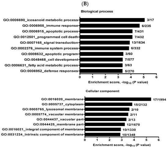 GO analysis revealed that the top 10 biological processes affected by miR-3138 included apoptosis-related processes (GO:0006915/0012501/0008632), immune system response (GO:0006955), signal transduction (GO:0007165), cell development (GO:0048468), defense response (GO:0006952), and lipid metabolism (GO:0006690/0006631). The most affected cellular components annotated seven membrane-related GO terms (GO: 0016020/0005765/0005774/0044437/0044425/0016021/0031224) and one cytoplasm-related GO term (GO:0005737) (Figure 4B). There were none annotated in the molecular function component of GO analysis.