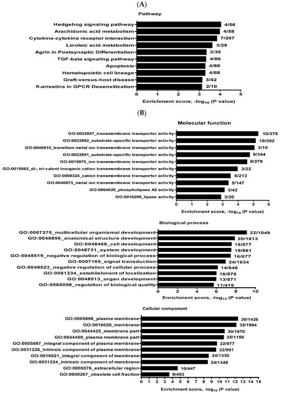 For miR-3679-5p, the top three KEGG pathways pointed to Hedgehog signaling, arachidonic acid metabolism, and cytokine–cytokine receptor interaction (Figure 5A). The top 10 enrichments in the molecular function component of GO analysis are mainly related to membrane transporter (GO:0022857/0022892/0046915/0022891/0015075/0015082/0008324/0046873) and lipase activities (GO:0004620/0016298). The biological process component annotated most of the GO terms on development (GO:0007275/0048856/0048468/0048731/0048513), next regulation of biological processes (GO:0048519/0048523) and signal transduction (GO:0007165). The cellular component of GO analysis annotated 8 of the top 10 enrichments on membrane-related terms (GO:0005886/0016020/0044425/0044459/0005887/0031226/0016021/0031224) (Figure 5B).