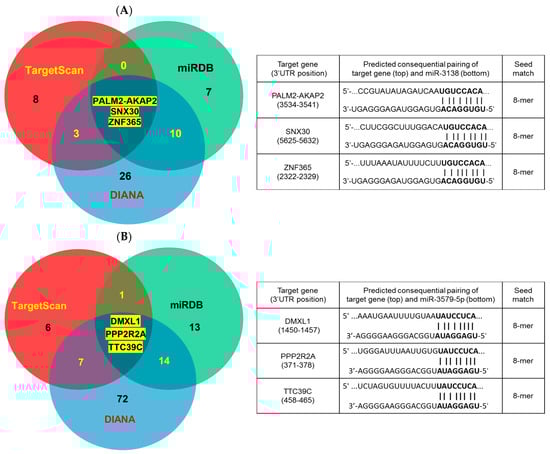 Bioinformatic prediction of the target genes for miR-3138 (A) and miR-3679-5p (B). Venn diagrams show overlapped target numbers predicted by TargetScan (red), miRDB (green), and DIANA (blue) databases. The pairing patterns between the sequences of target gene 3’UTR and miRNA are shown below each diagram.