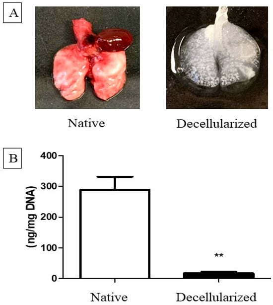 (A) Lungs before (native) and after decellularization process. (B) Analysis of DNA quantification in decellularized lungs (n = 5). Data represent mean ± standard error (SEM). The asterisk indicates the significance of the difference between the groups (** p < 0.001). Lung scaffolds obtained by decellularization showed genomic DNA content in the range of 17.75 ± 2.05 ng/mg (below the 50 ng/mg suggested by Crapo et al. [] (B).