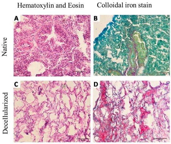 Lung scaffolds obtained by decellularization showed genomic DNA content in the range of 17.75 ± 2.05 ng/mg (below the 50 ng/mg suggested by Crapo et al. []) (Figure 1B) and lacked cellular nuclei, as assessed using hematoxylin and eosin (H&E) and Colloidal iron staining (Figure 2).