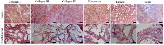 Immunohistochemical analysis (one lobe). Presence of collagens I, III, and IV and fibronectin, laminin, and elastin. Scale bar = 100 µm.