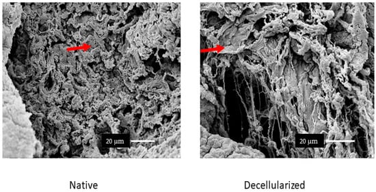 Scanning electron microscopy images. The sections indicate the maintenance of the tissue architecture indicated by the red arrows. Scale bar = 20 µm.