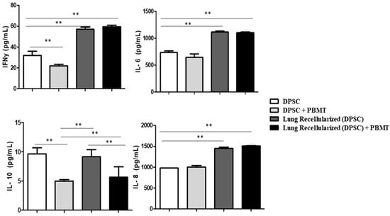 Effect of PBMT therapy on lung recellularization regarding the levels of IL-6, IL-8, IFN-y, and IL-10 after 24 h in the cell culture supernatant of tooth pulp stem cells. Data represent mean ± standard error (SEM). Asterisks indicate significant differences between the groups (** p < 0.001).