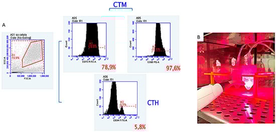 Initially, the DPSCs (1 × 106) were suspended in 1 mL of RPMI 1640 medium supplemented with 15% SFB, 2 mM glutamine, and 1% of penicillin–streptomycin []; filtered through a 40 µm cell filter to remove groups of cells; and injected into the left and right bronchi of the decellularized lungs using a 20-gauge catheter. The lungs were placed with the medium in a 25 mL falcon tube of ideal size to simulate a rib cage and sterilized with PBMT by irradiation at 660 nm in the red light wavelength, at a dose of 3 joules (30 s each), before DPSC seeding (Figure 6B). To induce cell proliferation, the recellularized lung + PBMT group was irradiated with infrared light at 880 nm at the same dose of 3 joules (30 s each). The lungs from both groups were left in an incubator to allow the cultivation of cells at 37 °C under 5% CO2 and 95% of atmospheric air in pulmonary differentiation medium, entirely sealed and sterile, remaining for a culture period of 24 h [] and maintaining a ventilatory method with constant positive pressure of 20 cmH2O and 90% O2 []. During the recellularization process, 2 mL of the medium was removed and the same amount of fresh medium was added every 12 and 24 h for ELISA evaluation.