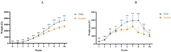 Weight changes in male and female Muscovy ducks at different ages. (A): Growth curves. (B): Weekly weight gain curve. Female: the female Muscoy duck group. Male: the male Muscoy duck group. “**” indicates p < 0.01; “***” indicates p < 0.001; “ns” indicates p > 0.05.