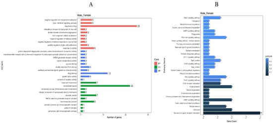 GO and KEGG enrichment analysis of differential genes. (A): GO enrichment entries of male and female group. (B): KEGG enrichment entries of male and female group.