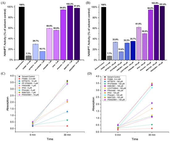 PAK4 inhibitors inhibit NAMPT activity in a cell-free assay. (A,B) NAMPT activity in response to PAK4 inhibitors (KPT-9274, PF-3758309, GNE2861, and LCH7749944), group I (PAK1-3) inhibitors (IPA-3 and FRAX486), phloretin (a natural compound unrelated to kinase inhibitors), MEK inhibitors (BI-847325 and PD0325901), the solvent control (DMSO), and FX866, the positive control. (C,D) Absorption (A450), reflecting NAMPT activity for PAK4 inhibitors at 0 min and 30 min. The results indicate that all PAK4 inhibitors inhibited NAMPT.
