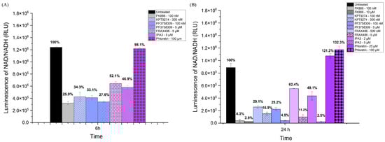 The NAD/NADH-Glo assay (catalog no. G9071) kit was obtained from Promega (Madison, WI, USA). The assays were conducted in triplicate, according to the manufacturer’s protocol. The cells were plated at 5000 cells/well in white-walled, 96-well plates and incubated overnight. The old media were replaced by fresh media containing the different inhibitors. After 24 h of treatment, the NAD/NADH-Glo Detection Reagent was added into each well and incubated for 60 min at room temperature. This reagent contains a formulation that reacts with NADH to produce a luminescent signal. After cell lysis, the total NAD/NADH was assessed by luminescence using a plate reader (Infinite 200 PRO, Tecan Austria GmbH). The NAD+ levels are measured by converting NAD+ into NADH, which then reduces a substrate to luciferin. The light emitted by luciferin, detected by Ultra-Glo™ rLuciferase, reflects the levels of NAD+ and NADH in the sample.