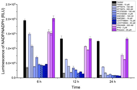 The NADP/NADPH-Glo assay (catalog no. G9081) kit was obtained from Promega. This kit works according to a similar mechanism, but NADP/NADPY is measured instead of NAD/NADH. The assays were conducted in triplicate and according to the manufacturer’s protocol. The cells were plated at 5000 cells/well in white-walled, 96-well plates and incubated overnight. The old media were removed and replaced by fresh media containing different inhibitors. The NADP/NADPH-Glo Detection Reagent was added into each well at 6 h and 24 h treatment. The reaction was incubated for 60 min at room temperature. The cells were lysed and the total NADP/NADPH was measured by luminescence using a plate reader (Infinite 200 PRO, Tecan Austria GmbH). The NADP+ levels are measured by converting NADP+ into NADPH, which then reduces a substrate to luciferin. The light emitted by luciferin, detected by Ultra-Glo™ rLuciferase, reflects the levels of NADP+ and NADPH in the sample.
