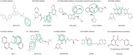 Structure of PAK inhibitors and control drugs. (A). KPT-9274, bearing a pyridine core. (B) PF-3758309, bearing an imidazole and a pyrazole. (C) Other PAK4 inhibitors (GNE-2861 and LCH-7749944) bearing pyrimidines and their benzo derivative. (D) FRAX486, a group I PAK inhibitor that also partially inhibits PAK4, bears an imidazole. (E) PAK1 inhibitor IPA-3; (F,G) MEK inhibitors BI-847325 and PD0325901; (H) NAMPT inhibitor FK866; (I) Phloretin, a compound without imidazole and pyrazole, unlike PAK4 inhibitors. Based on the chemical structures, the pyrimidines or benzo derivatives in PAK4 inhibitors are predicted to bind to NAMPT or PAK4. The groups that interact with NAMPT are highlighted with green circles.
