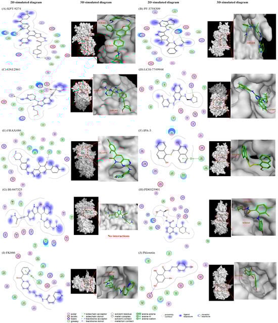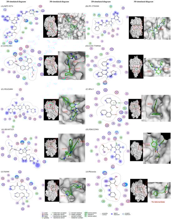 The predicted interactions between different drugs and the PAK4 protein. (1) PAK4 inhibitors: (A) KPT-9274, (B) PF-3758309, (C) GNE-2861, and (D) LCH-7749944. (2) PAK1 inhibitors: (E) FRAX486 and (F) IPA-3. (3) MEK inhibitors: (G) BI-847325 and (H) PD0325901 (mirdametinib). (4) Positive control (I) FK866 and negative control (J) phloretin.