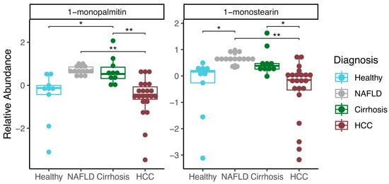 We set out to identify minimally invasive biomarkers for liver diseases, which included NAFLD, cirrhosis, and HCC in different biofluids. The clinical characteristics of our patient cohorts are described in Table 1 and Table 2. A total of 111 salivary metabolites passed quality control (see Methods). We performed an ANOVA to identify significant associations among the four cohorts and each metabolite. This revealed 1-monopalmitin and 1-monostearin (FDR p < 0.05) as being significantly different between groups (Supplementary Table S2). Pairwise logistic regression revealed that 1-monopalmitin and 1-monostearin were significantly decreased in HCC compared to NAFLD (Log2FC: −1.578, −1.156) and cirrhosis (Log2FC: −1.391, −0.782), respectively (Figure 1, Supplementary Table S3). Additionally, 1-monostearin was significantly increased in NAFLD compared to in individuals in the healthy group (Log2FC: 0.699), while 1-monopalmitin was significantly increased in those with cirrhosis compared to those in the healthy group (Log2FC: 0.942). Neither metabolite was significantly associated with age, BMI, sex, or smoking status after adjusting for disease status (p > 0.1).
